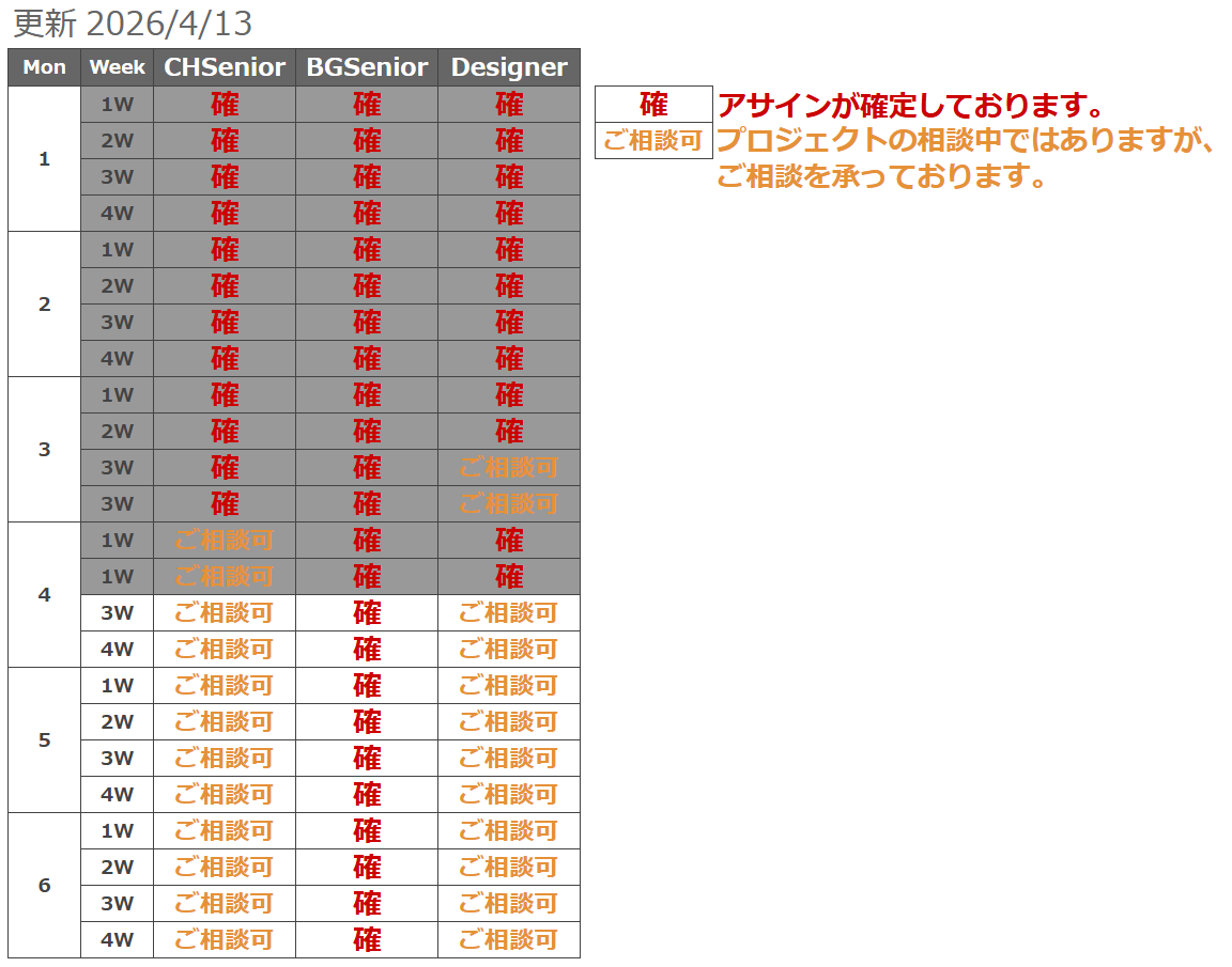 毎週月曜日にアサイン状況を更新いたします。